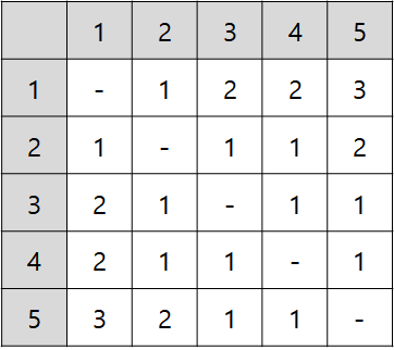 그럼 이걸 간선 가중치 1의 무방향 그래프라 보고 모든 회원에서 회원으로 거리를 재보면 다음과 같다. 즉, 서로 몇다리를 거쳐 친구인지 확인해 보는 것이다.