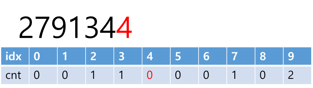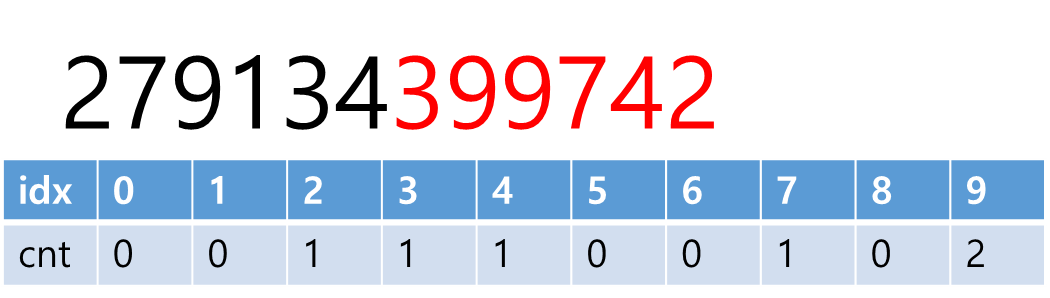 T위치와, 그 이후에 나온 숫자를 몇 번씩 나왔는지 카운팅한다. 이하 그림에서 idx 부분이 실제 숫자에 대입된다. 예를들어 idx=9일 때 cnt=2인데, T를 포함한 그 이후의 위치에서 '9'가 2번 나왔다는 의미이다.