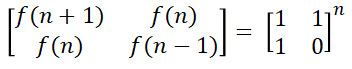 일단 10^18 이므로 그냥 구하기는 절대로 불가능한 수치임을 알 수 있다 ㅋㅋㅋ. 내 경우엔 피보나치의 경우 행렬의 거듭 제곱으로 풀 수 있다는걸 이미 알고 있었으므로 공식만 찾아서 풀었다. 공식은 f(n)이 n번째 피보나치라 할 때, 아래와 같다.