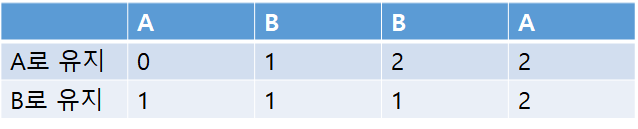 A로 유지하려면 dp[i][0] = min( dp[i-1][0]+1, dp[i-1][1]+1 )