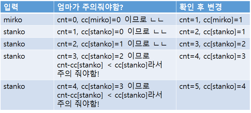 따라서 현재까지 나온 아이의 총 수를 cnt, 현재 아이가 나왔던 횟수를 cc[아이이름] 이라고 해보자. 그럼 만약 현재 아이의 이름이 A라고 할 때, 'cnt-cc[A] < cnt[A]' 라면 엄마가 주의를 줘야하는 경우가 된다. 예제 입력 1을 약간 변형한 다음 예시를 확인해보자.