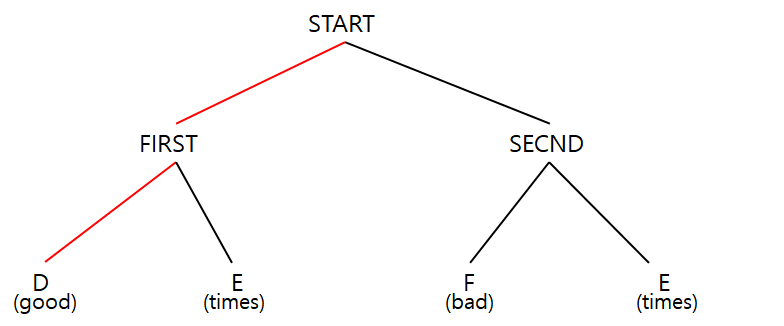 일단 START = FIRST + SECND 이므로 FIRST로 진행한다. FIRST는 leaf node가 아니고, FIRST = D + E 이므로 D로 진행한다. leaf node에서 "good"을 만났다.