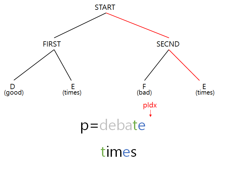 현재 leaf node에서 만난 "good"의 character를 순서대로 진행하며, 현재 pIdx가 가르키고 있는 p의 character와 동일하다면 찾은것이다. 그럼 pIdx를 1 증가시켜주는 식으로 비교하면 된다.