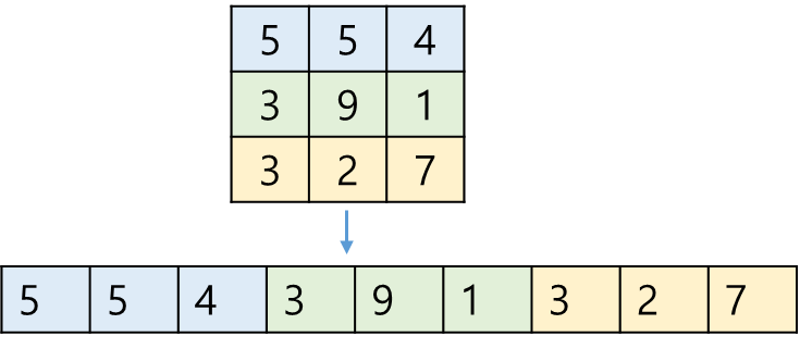 추가로 내 경우엔 2차원 배열로 안보고 그냥 1차원 배열로 보고 풀어봤다. 아래와 같이 row단위로 옆으로 쭉 펼쳐서 1차원 배열로 만든 형태이다.