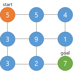결국 이 문제는 가장 적게 잃으면서 진행해야 하므로, 그냥 그래프에서 start부터 goal 까지의 최단거리를 찾는 것과 동일하다! 그리고 가중치가 모두 양수이면서, 서로 가중치가 다르므로 다익스트라(dijkstra)를 쓰면 될 것임을 알 수 있다. 평소 다익스트라를 그래프 형태에서만 해봤다면 배열형태라 좀 어색할수도 있겠으나 방식은 동일하다.