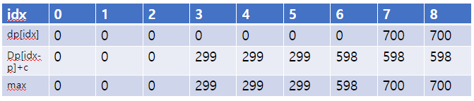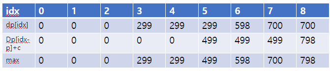 3. 두번째 입력값인 c=299, p=3을 보자. 마찬가지로 idx가 3이상에 dp 점화식을 적용하면 된다. 이번엔 표를 좀 더 세분화해서 확인해보겠다. 표에서 최종적으로 남는 값은 max값이다.