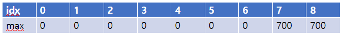 2. 첫번째 입력값인 c=700, p=7 을 보자. p=7 이므로 dp[7] 미만은 볼 필요가 없다(idx-p<0이므로). dp 배열에서 idx가 7 이상인 지점에 dp[idx] = max(dp[idx], dp[idx-p]+c) 점화식을 적용하면 된다.