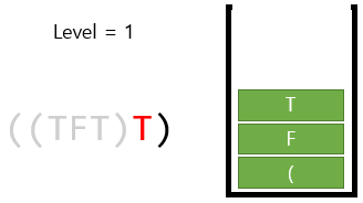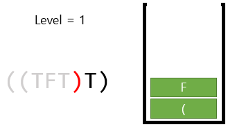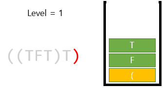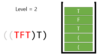 5. 다음으로 ')'를 만났다. 그럼 스택에서 하나씩 빼면서 '('가 나올 때 까지, 현재 레벨인 '2'에 따른 AND 또는 OR을 적용하면 된다. 뭘 해줘야할지 정하는 방법은 이따 다시 얘기할꺼고, 일단 여기서는 AND를 하면 된다. T and F and T = F 이다.