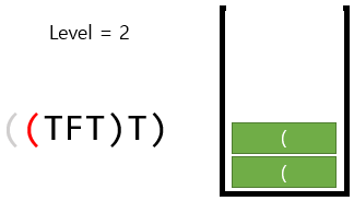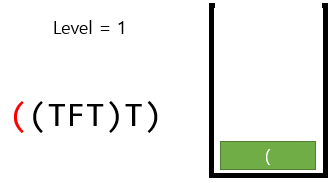 뭐 트리로 그려져 있는 문제이니 트리로 풀어야겠다고 생각할 수 있는데, 스택에 '(', 'T', 'F'는 넣고, ')'를 만날 경우 스택에서 '('가 나올 때 까지 전부 빼버리는식으로 진행하면 현재 트리의 레벨을 더 간단하게 알 수 있다. 이 때, 레벨은 '('가 들어갈 때 1을 증가하면 되고, ')'를 만나서 '('를 만날 때 까지 'T','F'를 빼면서 계산하고 '('를 뺄 때 감소시키면 된다.
