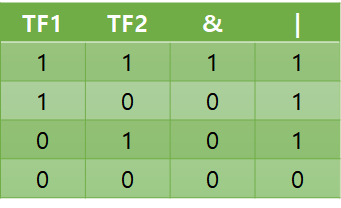 이제 계산방법도 알았고 레벨에 따라 OR, AND 중 뭘 써야할지도 알았다. 그럼 'T', 'F' 문자들을 가지고 OR, AND 연산은 어떻게 할 수 있을까? 뭐 여러 방법이 있을텐데, 내 경우엔 심플하게 T는 1, F는 0으로 바꿔서 스택에 넣었다. 그럼 0과 1에 대한 bitAND(&), bitOR(|) 결과값은 다음과 같다.