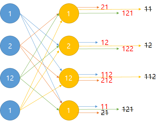 그럼 '만들 수 있는 정수'의 종류는 어떻게 알 수 있을까? 마찬가지로 제한 조건을 확인해보면서 생각해보면 된다. 우선 1부터 99까지의 정수이므로 0이 없어서, 숫자 앞에 0이 오는 경우는 무시해도 됨을 알 수 있다. 그리고 최대 99이므로 이 경우 최대로 나올 수 있는 정수는 99가 10번 주어진 경우이다. 그럼 10^21-1 까지 표현이 가능해야 한다. int는 물론이고 long으로도 표현이 불가한 숫자가 된다. 어차피 서로다른 수의 나열만 파악하면 되므로 그냥 String으로 다루면 될 것이다. 그리고 서로 다른 String의 가지수는 HashSet 등을 사용하면 쉽게 파악할 수 있다.