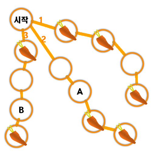 처음에 1번루트로 가보니 3개를 발견했다. 그럼 2루트로 진행해서 A지점까지 왔을 때, 더이상 해당 경로를 살펴볼 필요가 있을까? A 지점에 왔을 때 이미 2칸을 왔고, 나머지 2칸에 모두 당근이 있다 해도 최대 2개다. 그러므로 더이상 진행할 필요가 없으니 되돌아와서 루트3으로 간다. 마찬가지로 B까지 왔을 때 더이상 살펴보지 않아도 된다.