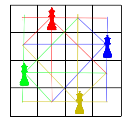 2. 대각선으로도 놓을 수 없으므로 대각선에 대한 체크도 해볼 수 있다. 배열 형태로 체스판을 만들고 어떠한 위치에 놓았다면 실제로 배열에 체크해서 확인해도 되고, 그냥 계산식을 짜서 확인해도 된다. (1번 퀸과 2번 퀸에 대해 두 퀸의 위치의 좌우 차이와 상하 차이의 절대값이 동일하다면 대각선이라고 볼 수 있다.)