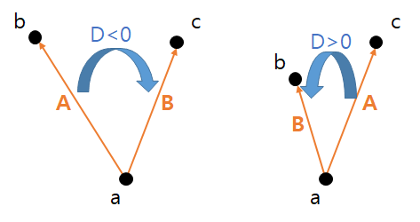 - D<0 이라면 $\textbf{A}$를 기준으로 $\textbf{B}$는 시계 방향이다.
