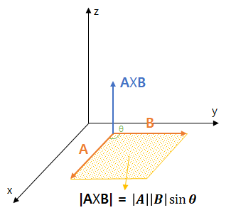 따라서 $\textbf{A}\times\textbf{B}=(0, 0, x_1y_2-y_1x_2)$ 가 된다. - 두 벡터 $\textbf{A}, \textbf{B}$의 외적의 결과는 두 벡터에 동시에 수직이고 그 크기가 $\left|\textbf{A}\right|\left|\textbf{B}\right|\sin{\Theta}$ 인 벡터이다. 위의 $\textbf{A}\times\textbf{B}$ 결과에 z축 성분만 있는걸보면 두 벡터에 동시에 수직이라는 것을 알 수 있다. 또한 $|\textbf{A}\times\textbf{B}|$는 z축 성분만 있으므로 z축의 값 자체가 크기가 된다. $\left|\textbf{A}\times\textbf{B}\right|=x_1y_2-y_1x_2$ 이다.
