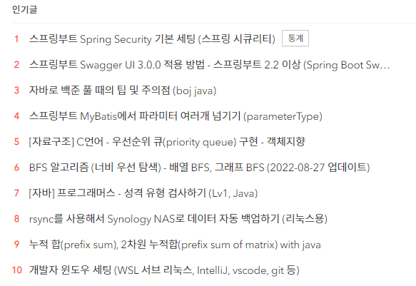 1달 기준 인기 순위는 아래와 같다. 알고리즘 풀이글은 확실히 인기 순위엔 잘 못드는 것 같다.