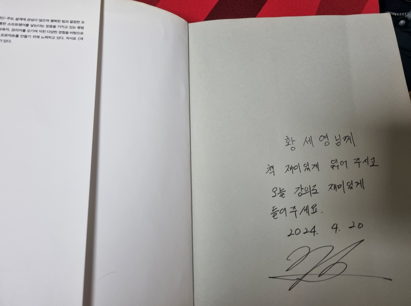 그 외에도 오프라인 강의다보니 1년넘게 같이 스터디 하면서 절 알려주시던 쿄잉님도 뵙고, 골프님도 뵙고 좋았다. 그리고 개발서적 중 가장 재밌게 봤던 오브젝트 책에 저자이신 조영호님의 사인을 받을 수 있었다! 2024년 POTG가 아닐까 싶다. 이후 인프런 객체지향 강의랑 오브젝트 다음 책을 준비중이시라던데 너무 기대된다. 이후에도 혹시 오프라인 강의 여시면 또 가야지.