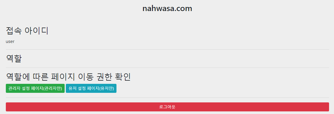 반대로 회원가입을 하거나, user/1234로 접속해보면 관리자 페이지는 403, 유저 페이지는 정상적으로 접근되는 것을 볼 수 있습니다.