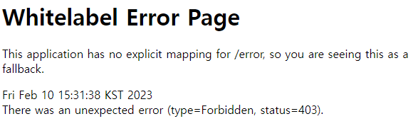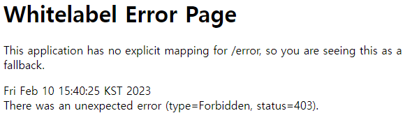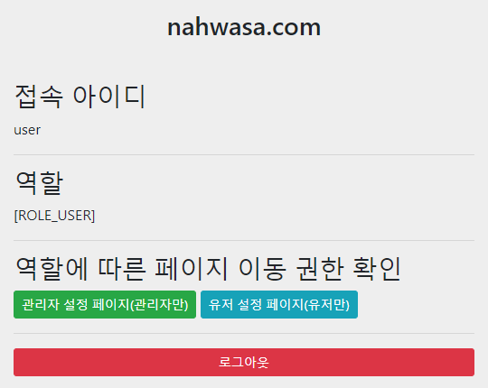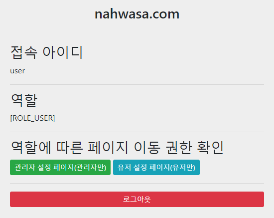 반대로 회원가입을 하거나, user/1234로 접속해보면 관리자 페이지는 403, 유저 페이지는 정상적으로 접근되는 것을 볼 수 있습니다.