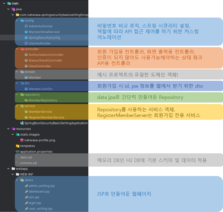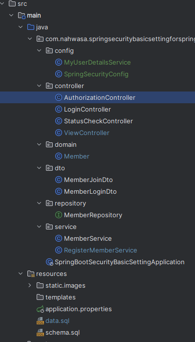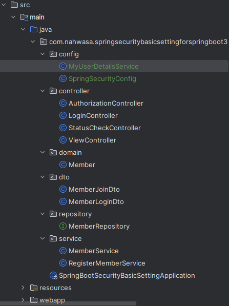 이후 위 화면들의 문제점을 해결하기 위해 스프링 시큐리티를 적용할겁니다. 최종적으로 완료된 프로젝트 형태는 다음과 같습니다.