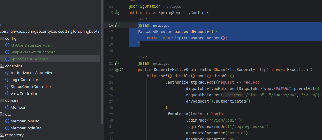 - 스프링 시큐리티를 위해 Configuration을 추가해줍니다. config 패키지를 만들고 SpringSecurityConfig 클래스를 다음과 같이 추가했습니다. 설정에 대한 간단한 설명은 주석으로 달아두었습니다.