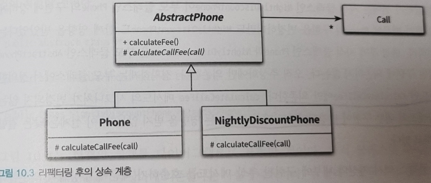 - Phone의 코드를 재사용하고 중복 코드를 제거하기 위해 Phone의 자식 클래스로 NightlyDiscountPhone을 만든건데, 세금을 부과하는 로직을 추가하기 위해 Phone을 수정할 때 유사한 코드를 NightlyDiscountPhone에도 추가해야 했다. 즉 새로운 중복 코드를 만들었다.