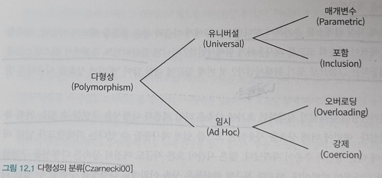 - 매개변수 다형성 : 클래스의 인스턴스 변수나 메서드의 배개변수 타입을 임의의 타입으로 선언한 후 사용하는 시점에 구체적인 타입으로 지정하는 방식. 예를들어 자바에서 제너릭 타입으로 List에서 임의의 타입 T로 보관할 요소를 지정하고 있다. 실제 인스턴스를 생성하는 시점에 T를 구체적인 타입으로 지정할 수 있다.