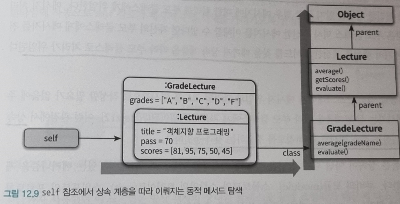 ⚈ 동적 메서드 탐색의 입장에서 상속 계층은 메시지를 수신한 객체가 자신이 이해할 수 없는 메시지를 부모 클래스에게 전달하기 위한 물리적인 경로를 정의한 것으로 볼 수 있다. 적절한 메서드를 찾을 때까지 상속 계층을 따라 부모 클래스로 처리가 위임된다.
