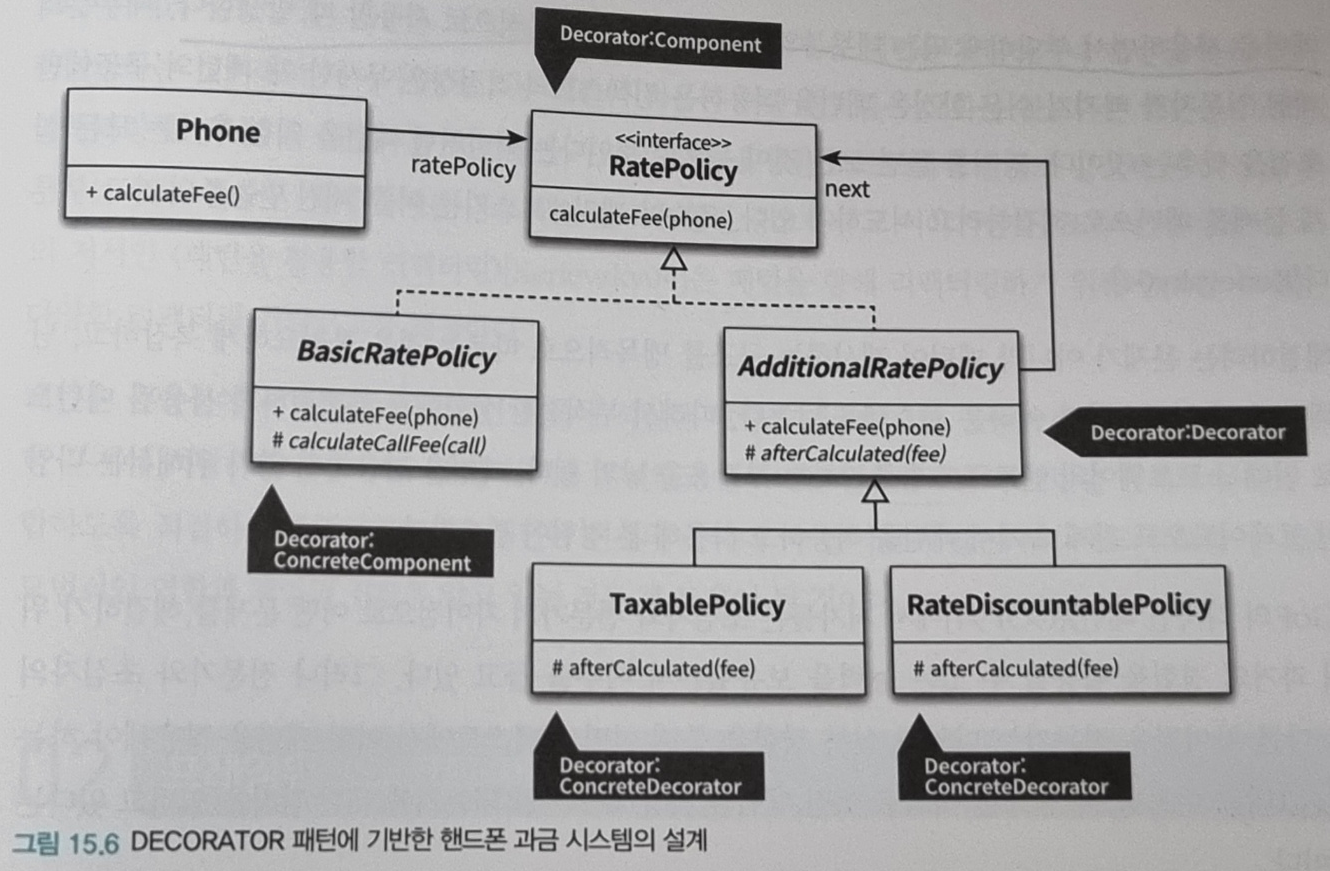 - 핸드폰 과금 시스템 설계는 DECORATOR 패턴을 기반으로 한다. DECORATOR 패턴은 객체의 행동을 동적으로 추가할 수 있게 해주는 패턴으로 기본적으로 객체의 행동을 결합하기 위해 객체 합성을 사용한다. DECORATOR 패턴은 선택적인 행동의 개수와 순서에 대해 변경을 캡슐화할 수 있다.