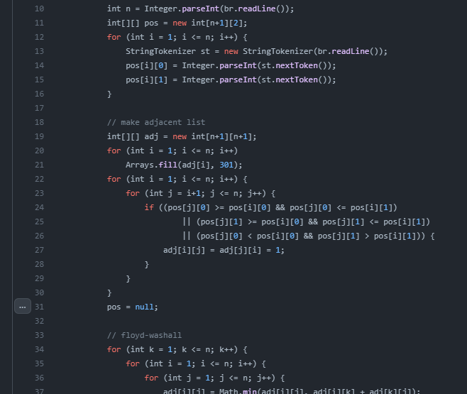 이 부분은 뭐 맞는말이긴 하지만, 크게 공감은 안됬다. GC 처리 안되도록 망치는게 더 힘들지 않나? 생각된다. 알고리즘 문제 풀 때 메모리 초과 날 때 직접 객체 참조를 해제하는 경우는 꽤 많이 있지만, 실무에서 코드 구조 잘 나누었고, 정말 엉뚱한 코드를 짜지 않는이상 문제가 생길일이 있을지 잘 모르겠다. 이하 백준 14588번을 푼 코드이다. 알고리즘 풀이의 경우 아무래도 절차지향적으로 짜기 좋은 경우가 많다보니 해당 객체로 처리할 부분은 다 해서 필요가 없더라도 한 함수에 메모리가 해제되지 않는 변수가 존재할 수 있어 메모리가 부족하다면 아래처럼 해제해주는 편이다(pos = null;).