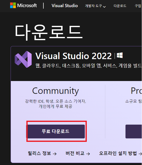 이 경우 https://visualstudio.microsoft.com/downloads/ 에 접속해 커뮤니티 버전을 다운로드 후 설치한다.