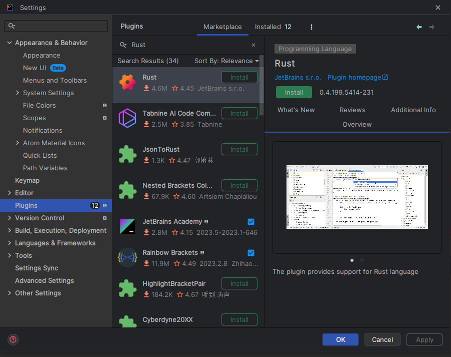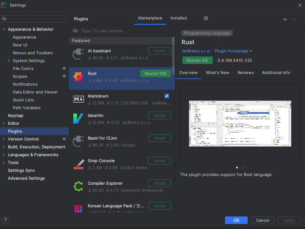 File -> Settings -> Plugins -> Marketplace 에서 Rust를 검색해서 설치해주자. 설치 완료 후 인텔리제이를 재부팅 해주자.