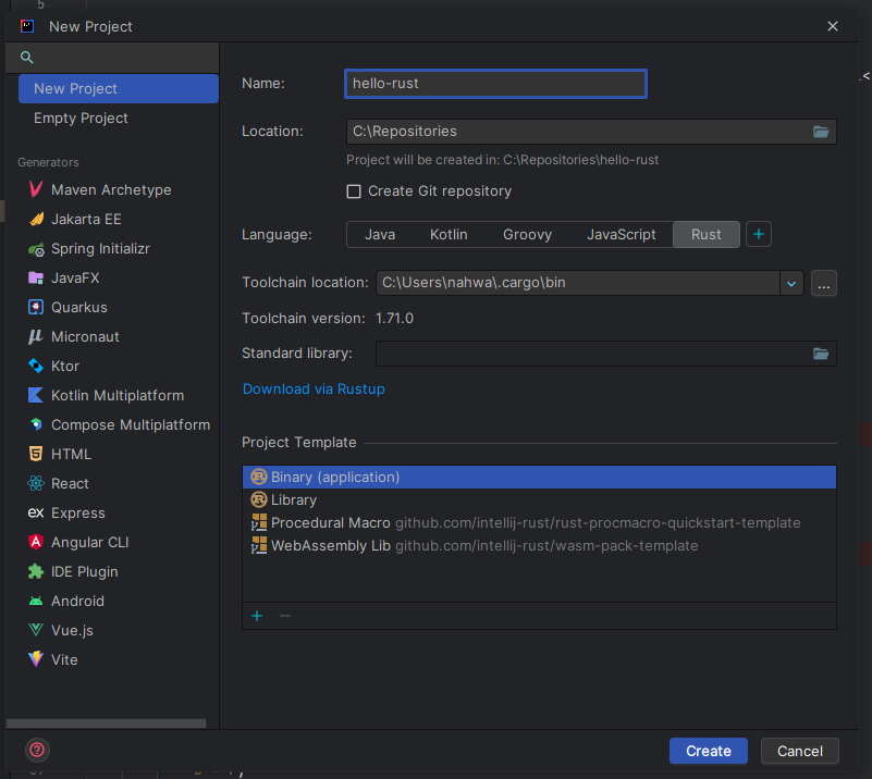 그럼 New Project에서 Rust로 프로젝트를 생성할 수 있다.