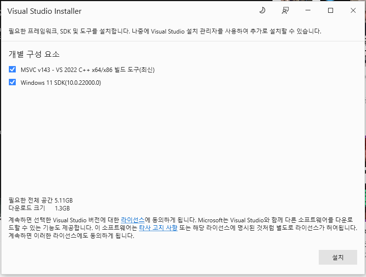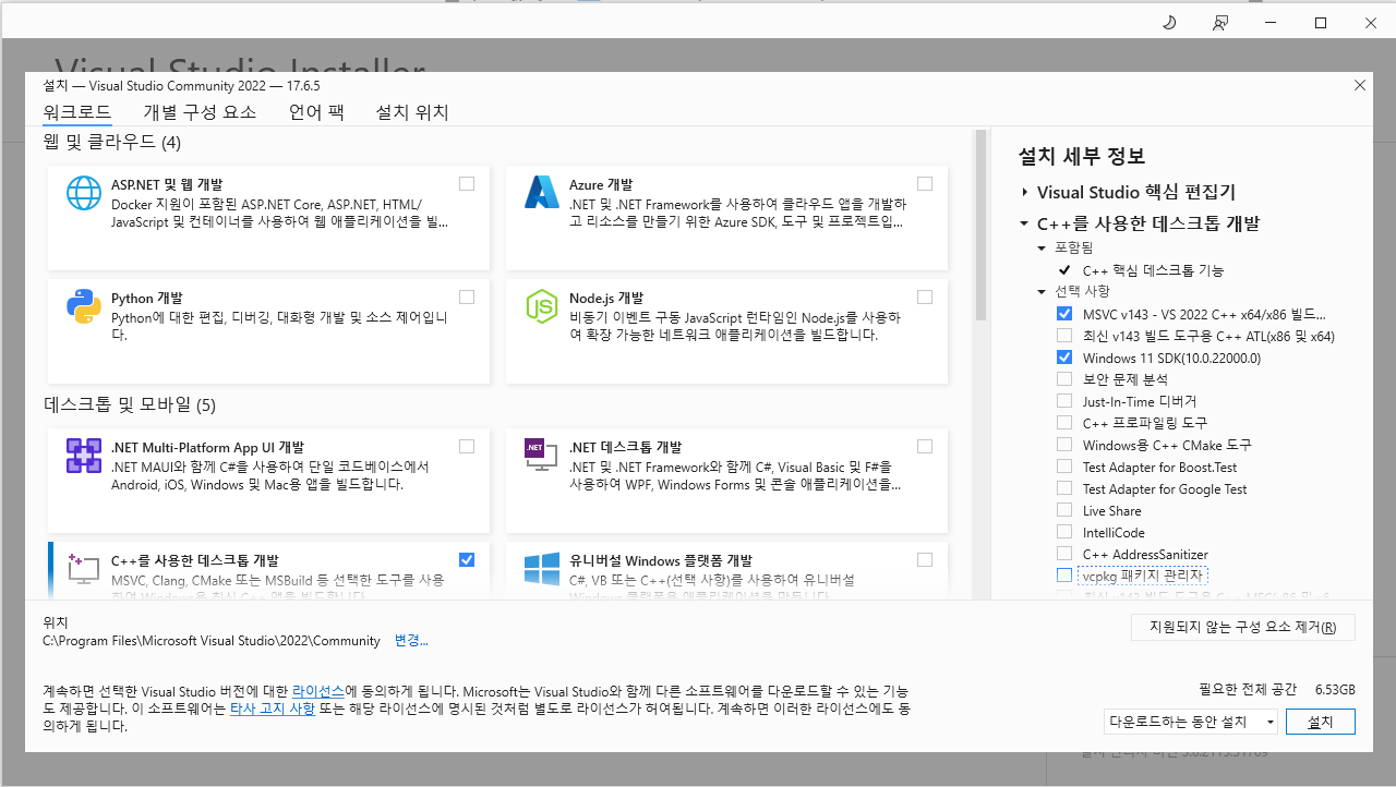 어차피 이 글을 보는 사람이라면 Visual Studio 사용 안할테니 다 체크 해제하고 아래처럼만 설치하면 된다. C++을 사용한 데스크톱 개발만 켜두고, '설치 세부 정보'에서 MSVC랑 Windows 11 SDK만 고르면 된다. 윈도우 10을 사용중이라도 11 SDK 저거 설치 해야 된다. 왜냐면 윈 10이라 궁금해서 안해보니 에러나는걸 확인했기 때문이다..