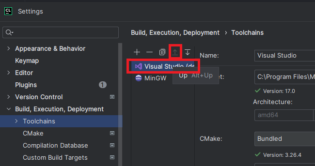 이 경우 File -> Settings -> Build, Execution, Deployment -> Toolchains 에서 아래 이미지처럼 되도록 Visual Studio를 위로 올리자.