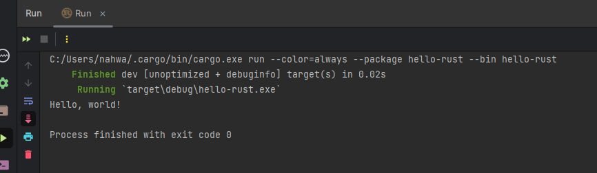 실행도 잘 된다! 참고로 저 Cargo는 Rust의 공식 빌드 도구로, gradle 같은거라고 보면 된다.