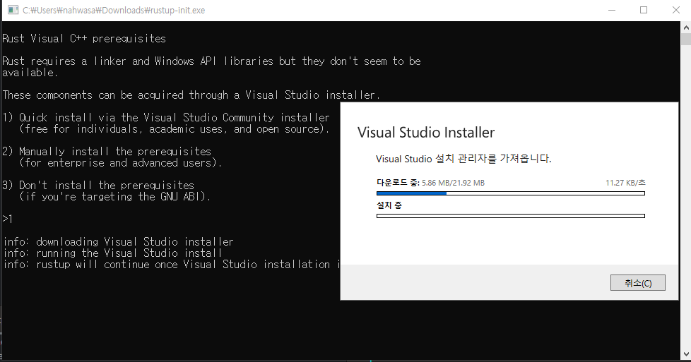 이제 rustup-init.exe를 껐다가 재실행하자. 그리고 '1'을 선택하면 된다.