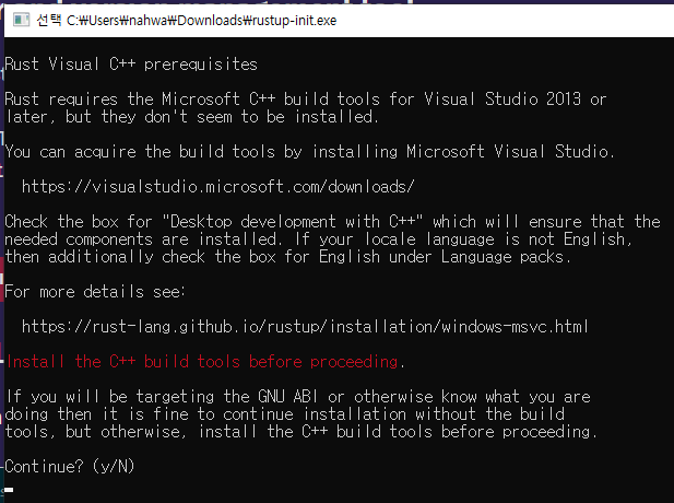Rust를 사용하려면 MSVC 라는게 필요하다. 이미 Visual Studio 같은게 깔려있었다면 아래처럼 메뉴가 나타날꺼다. '1'을 선택해 안내에 따라 설치를 진행하자.