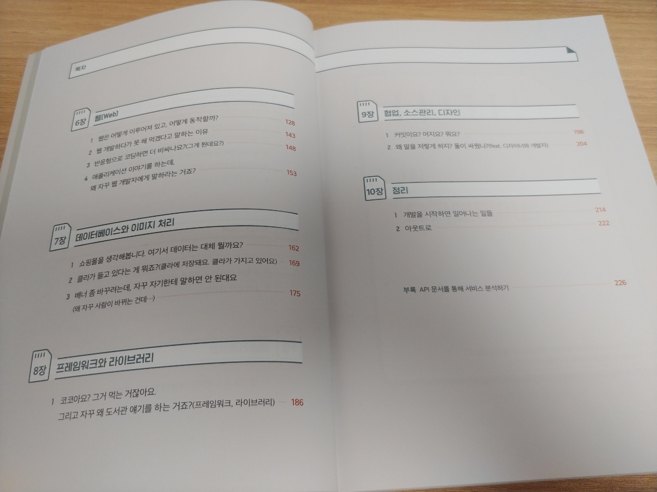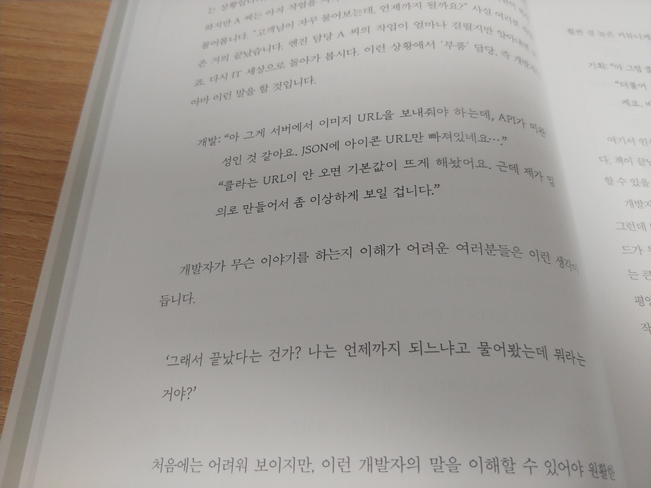 개발자가 하는 일이 무엇인지, 어떠한 과정을 통해 프로그램이 만들어지는건지 완전 디테일하게는 아니지만 전체적인 흐름을 알 수 있도록 잘 설명되어 있다. 배경 지식이 없는 사람에게 배경 지식을 쌓아주려는 목적이다보니 뭐 건너띄는 것 없이 엄청 친절하고 쉬운 단어와 예시들로 잘 설명되어 있다. 웹과 어플리케이션, 하이브리드 앱을 분리해서 설명한 점도 좋다. 구성도 상당히 마음에 드는데, 초반부에 개발자가 아니라면 이해하지 못할 대화같은것들을(혹시 개발자인데 위 스샷에서 '개발'이 말한 내용이 이해가 안된다면 일단 사셔야함ㅋㅋ) 보여준 후 책을 점점 읽어나가면서 그 말이 이해가 되도록 하는 과정이 상당히 마음에 든다.