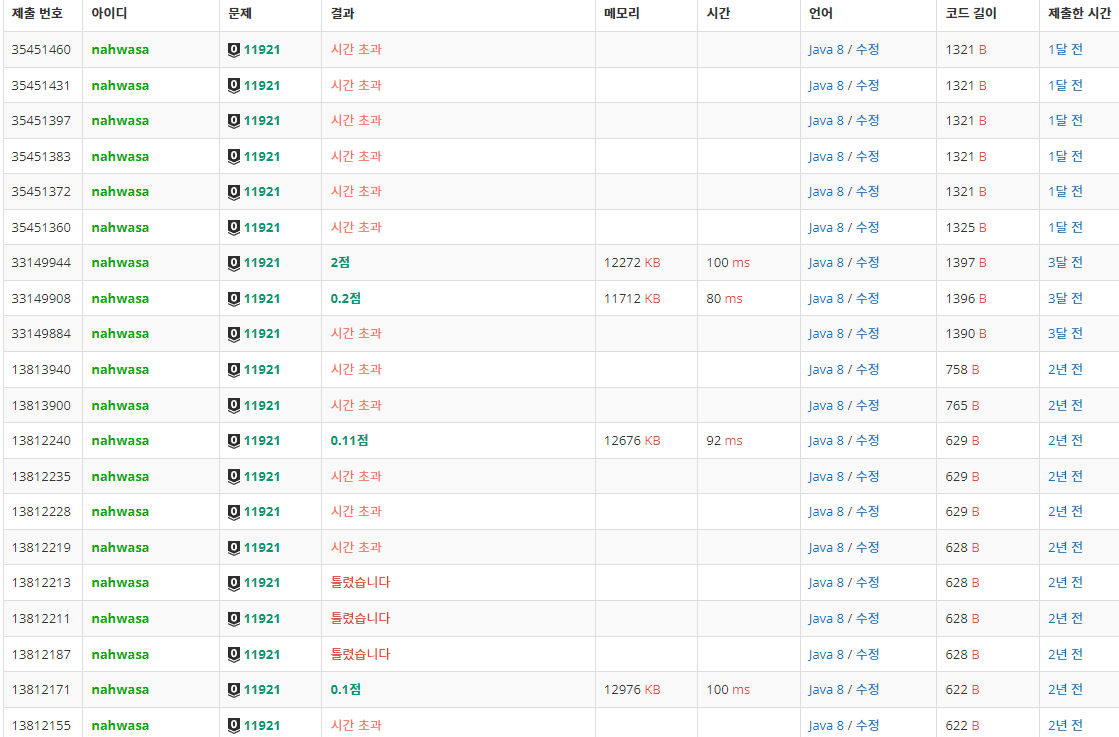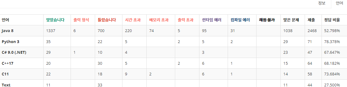 이런 문제들은 '백준에서 자바로 풀려면 난이도가 매우 상승하는 문제들' 글에 발견할 때 마다 추가하고 있다. 개인적으로 메모리 초과나서 자바로 아무도 통과 못하는 문제를 어떻게든 자바로 뚫어보는걸 즐기기는 하지만, 보통 억지로 메모리제한을 뚫기위해 3시간은 기본으로 걸리는 편이다. 그러니 정신건강상 위의 글에 나온 문제들은 피해가는걸 추천한다 ㅋㅋ