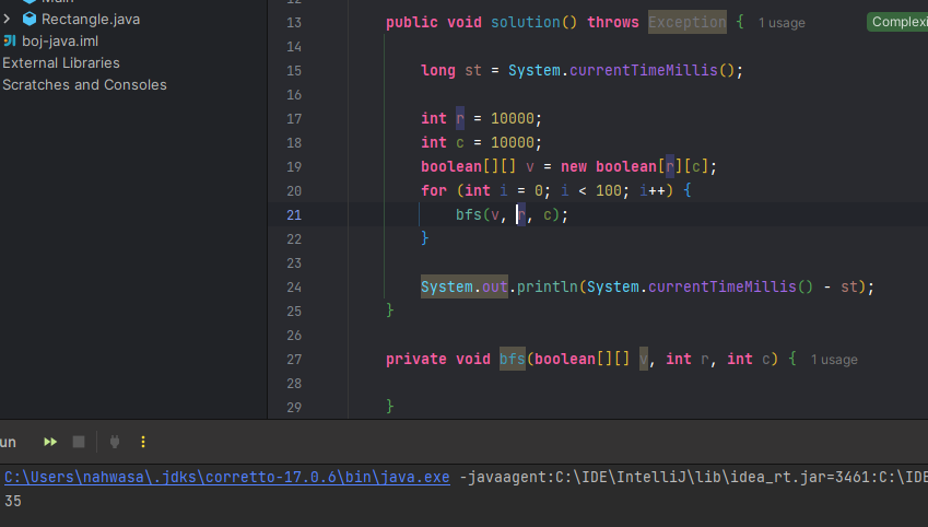 방문 체크 배열이 하나로 충분하다면 아래처럼 코드를 짜면 된다. 아래의 경우 35ms가 걸린다.