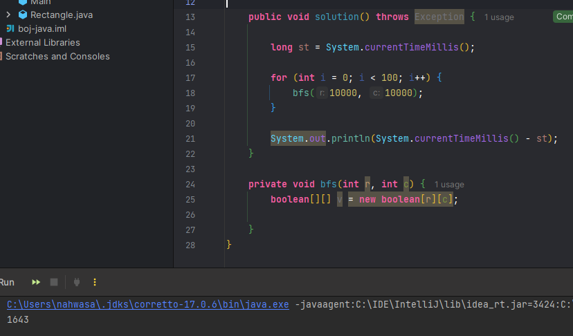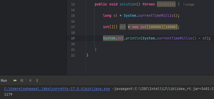 그럼 단순히 int형 RxC 짜리 배열(int[][] arr = new int[R][C])을 만들 때 시간 복잡도가 어떻게 될까? 당연히 O(1)일 것 같지만, 자바에선 무려 O(RC)가 필요하다. 이하 10만x1만 짜리 배열 하나 만든건데 이것만 1초가 넘게 걸린다.