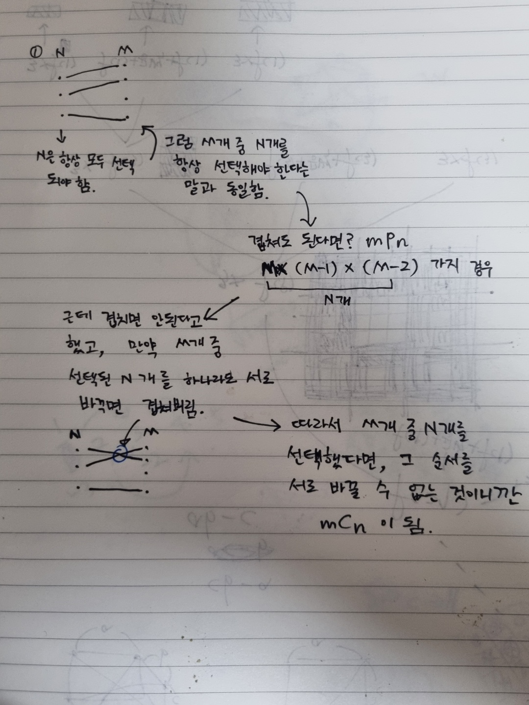 해설은 다음과 같다! 결론은 mCn을 구하면 된다. 코드에서 n = Math.min(n, m-n)은 mCn = mCm-n를 코드로 나타낸 것이다. 일단 연산 도중에 long의 범위를 넘어갈 수 있다. 간단하게는 코드처럼 BigInteger로 처리하면 되고, 사실 n과 m이 그리 크지 않으므로 오차만 적당히 조정해주면 double로 연산해도 통과할 수 있다.