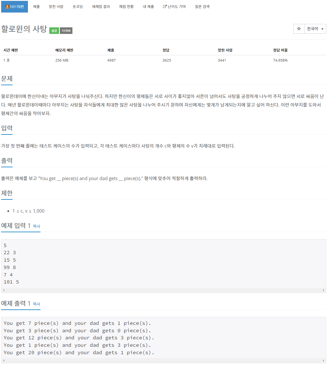 각 테스트케이스별로 c와 v를 입력받아서, c를 v로 나눈 몫과 나머지를 출력해주면 된다. 즉, "You get [c/v] piece(s) and your dad gets [c%v] piece(s)." 를 출력해주면 된다. 입출력 문제로 생각하는게 좋을 것 같다.