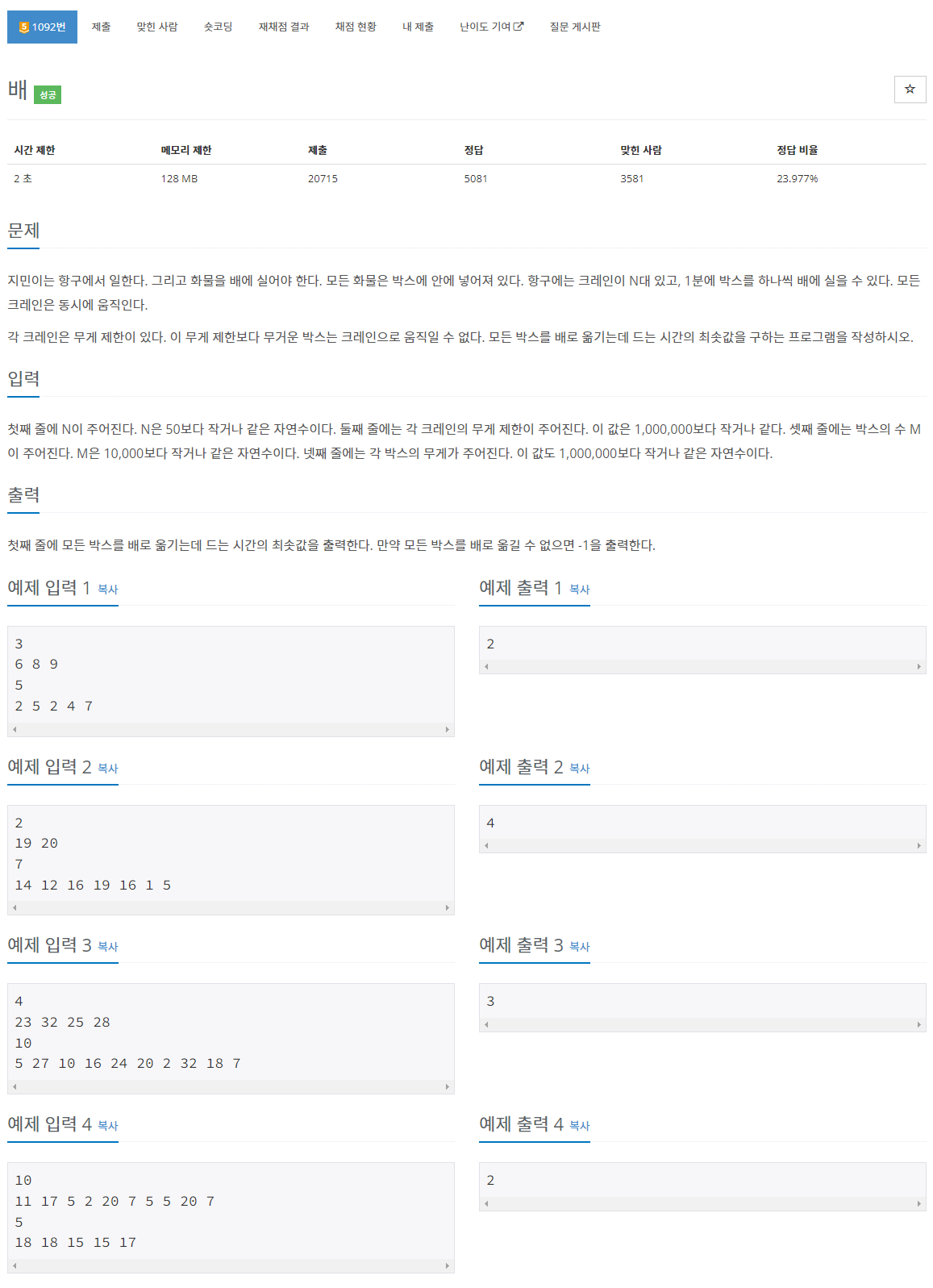 풀고나서 다른 사람들 코드를 보니 아예 다른 로직들이 보여서 좀 당황스러웠다. 보통 크레인 무게 제한 내림차순, 박스 무게 내림차순으로 정렬한 후, 각 크레인에 가능한 박스를 넣는 시뮬레이션 느낌으로 푼 것 같다.