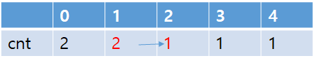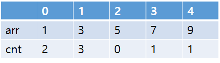arr 와 cnt는 다음과 같다. arr[0]에 '1'짜리 박스 2개, arr[1]에 '2'짜리 박스 1개와 '3'짜리 박스 2개, arr[2]는 없고, arr[3]과 arr[4]는 각각 '7'과 '8'짜리 박스가 카운팅된다.
