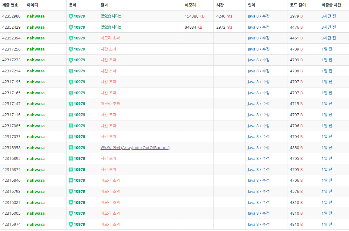 결국 31회의 시도로 개인 최장 시도횟수를 찍었고, 결국 뚫긴 했다. 10시간 넘게 걸렸다. 다른 분들 시도횟수까지 포함하면 자바 제출 시도 60회 만에 첫 통과이다 ㅋㅋㅋ