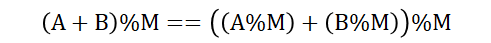 또 이 문제를 풀기 위해 알고있어야 하는 법칙이 있다. 나머지를 가지고 노는 여러 문제에서 제일 중요한 개념이라 이참에 익혀두자. 어떠한 정수 A와 B에 대해 A+B를 M으로 나눈 나머지는 'A를 M으로 나눈 나머지 + B를 M으로 나눈 나머지'를 다시 M으로 나눈 나머지와 동일하다는 얘기이다.