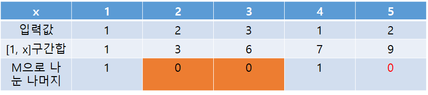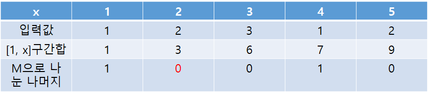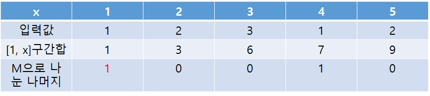 위 표를 통해 모든 x값에 대해 [1, x]의 구간합을 M으로 나눈 나머지를 알게되었다. 이걸 가지고 답을 구할 수 있다.