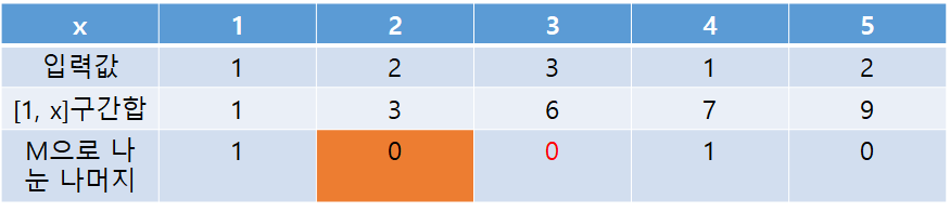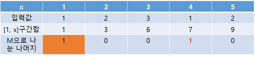위 표를 통해 모든 x값에 대해 [1, x]의 구간합을 M으로 나눈 나머지를 알게되었다. 이걸 가지고 답을 구할 수 있다.